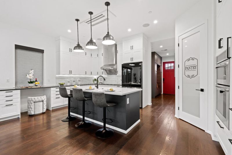 - 220 Volt Outlet, Cooktop - Electric, Countertop - Quartz, Dishwasher, Exhaust Fan, Garbage Disposal, Hood Over Range, Island with Sink, Microwave, Oven - Built-In, Oven - Electric, Pantry, Refrigerator