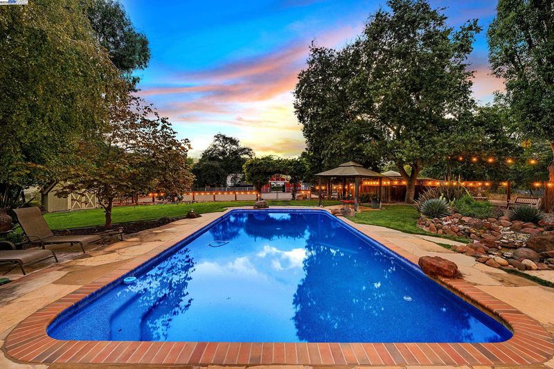 Experience the perfect blend of luxury living and country charm close to Downtown Pleasanton and adjacent to the prestigious Callippe Preserve Golf Course. This exceptional estate showcases a beautifully updated main residence, detached guest house, 13x35 covered RV storage, and multiple outbuildings with plenty of storage. Designed for entertaining and everyday living, the main home features a gourmet kitchen with professional appliances, large island, custom cabinetry, spacious pantry, and a wine room with wrought-iron detail. The inviting family room centers around a grand fireplace, while the expansive primary suite offers a private lounge, spa-like bath, and generous walk-in closet. Step outside to your private resort with a sparkling pool, heated pergola, and outdoor kitchen. Additional amenities include a 2-stall barn, riding arena, multiple garages, workshop, storage and so much room to expand the house or add additional structures. The charming guest house provides comfort and privacy. The zoning allows for either two horses or two large animals, if you choose. Enjoy amazing sunsets from this beautiful oasis.