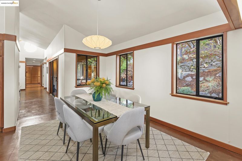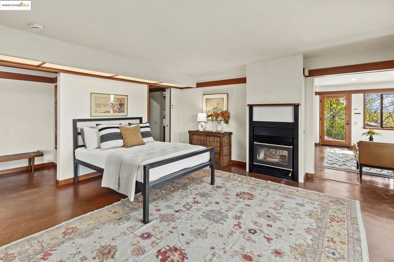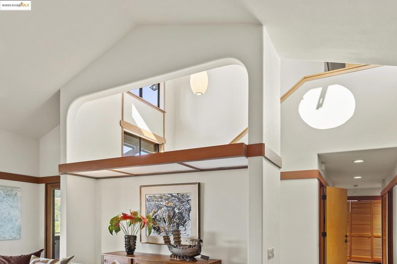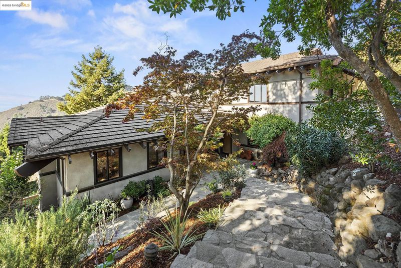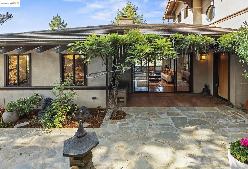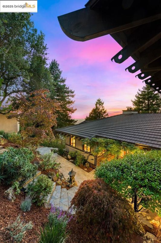 Japanese-influenced Claremont Hills home on a rare triple lot cul-de-sac, offers light, privacy, and Bay-to-canyon views. 5 bedrooms, 4.5 baths, 3,799 SF, soaring ceilings, integral color concrete floors, custom woodwork, decks, elevator, in-law, and radiant heat. It blends architectural sophistication with modern comfort and seamless indoor-outdoor flow.