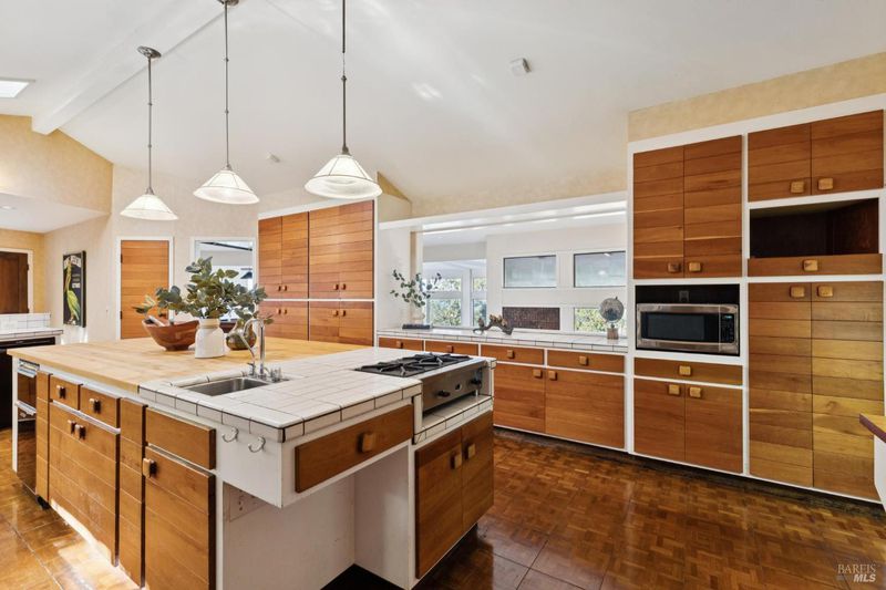 - Breakfast Room, Butcher Block Counters, Island, Island w/Sink, Pantry Cabinet, Tile Counter