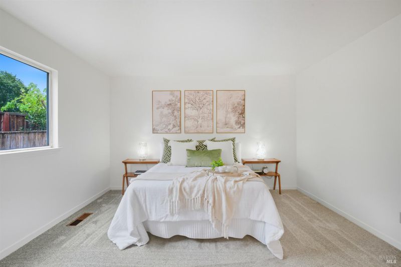 Recently refreshed with fresh interior paint and carpeting, this wonderful three bedroom, two bath, single-level home is ready for new homeowners. You will appreciate the separation of spaces between the living room and kitchen areas and the bedrooms and bathrooms. The living room is highlighted by vaulted ceilings, enhancing the sense of space and light, while the large primary bedroom suite features a generous walk-in closet. The grounds feature refreshed landscaping, patio in the backyard, and brick patio in the front yard. And, yes, there is A/C as well to keep you comfortable on those hot summer days! Conveniently located near schools, parks, shopping, highways 101 & 12, and all the Wine Country has to offer. Welcome Home!