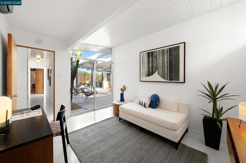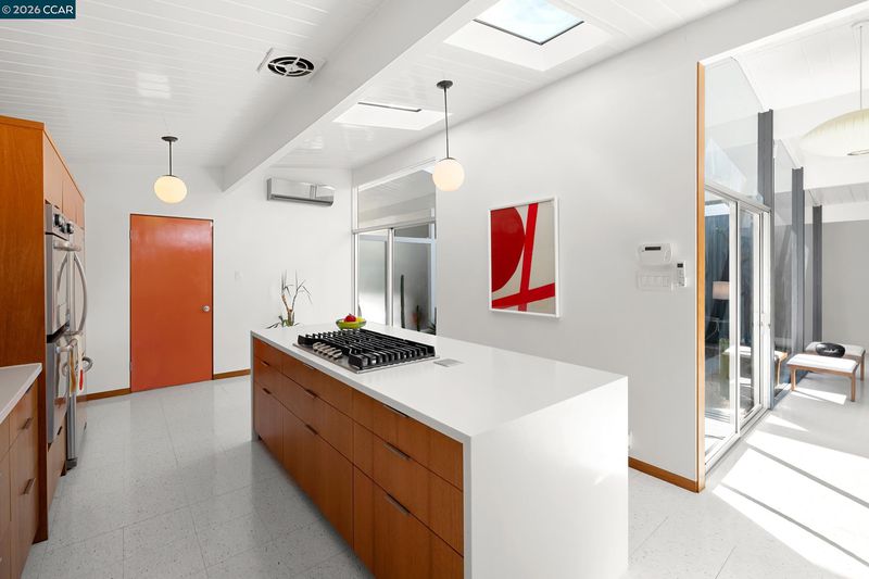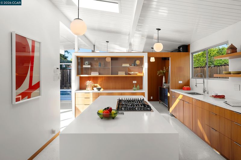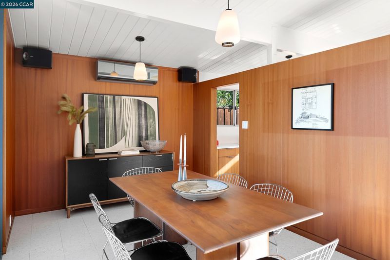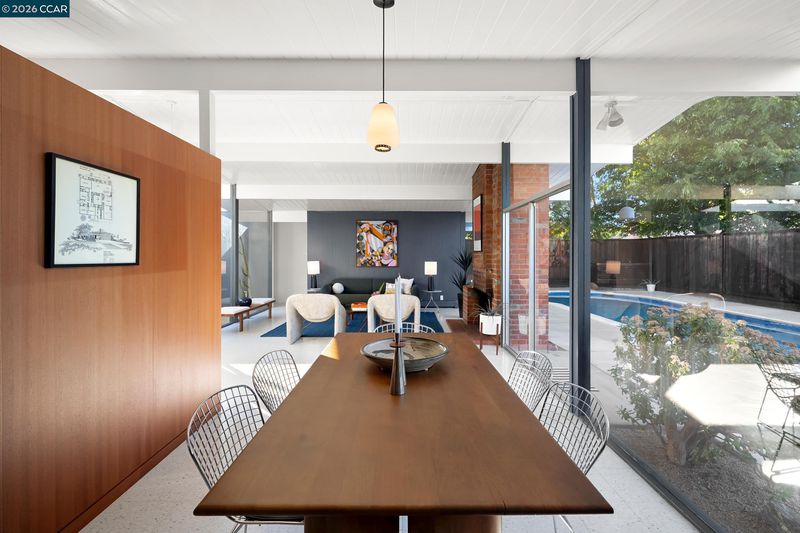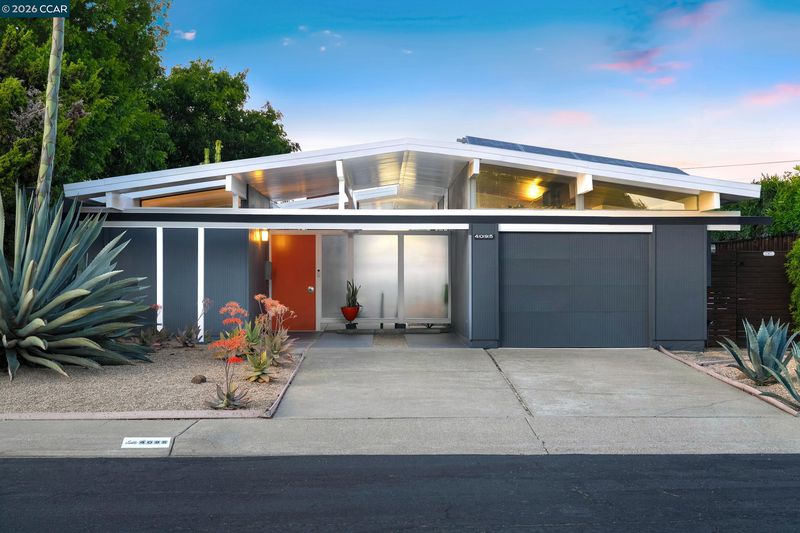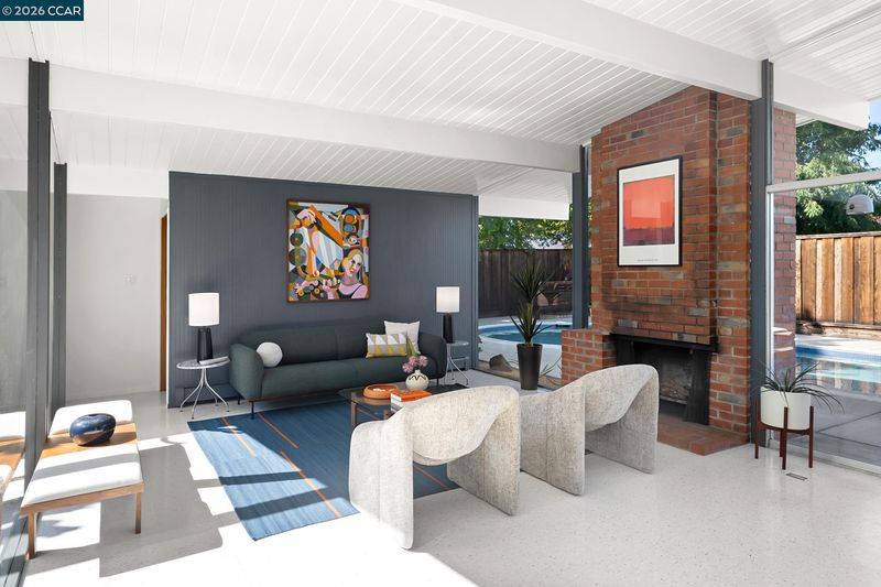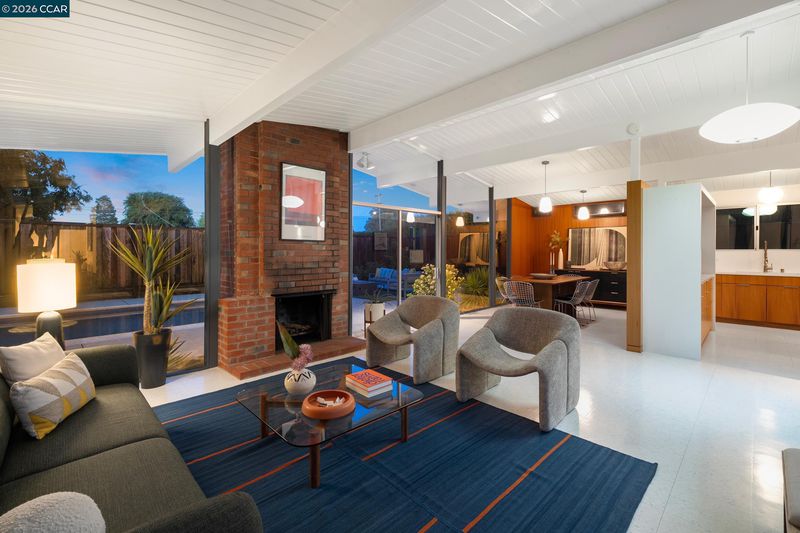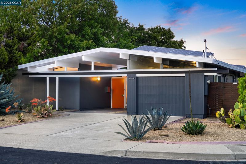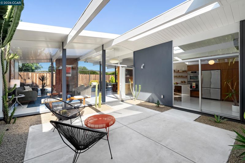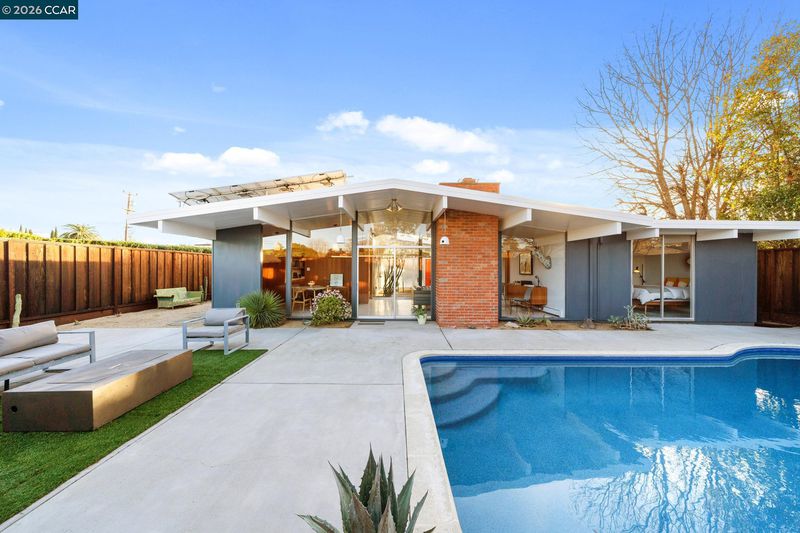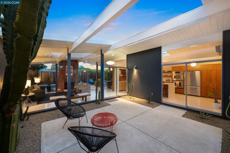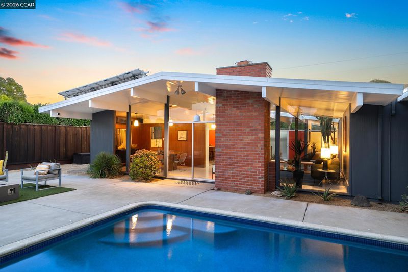 The epitome of California cool, this exceptional Eichler offers iconic mid-century modern living for the most discerning tastemakers. Built by renowned developer Joseph Eichler and designed by architects Jones & Emmons, this coveted pitched-roof, atrium, carport model, Plan OJ-1184, is an architectural offering that seamlessly blends timeless design with modern comfort. As featured in Atomic Ranch and the San Francisco Chronicle — and soon to be featured in an upcoming Eichler book, the home reflects a deep respect for its original design, enhanced by thoughtful, period-appropriate updates. Rich mahogany cabinetry by Berkeley Mills anchors the space, complemented by elegant wood paneling and classic VCT tile flooring that runs throughout, preserving its authentic mid-century character. Walls of glass flood the interiors with natural light, creating a bright and airy ambiance while fostering a seamless connection between indoor and outdoor living spaces. The signature atrium serves as a tranquil centerpiece, perfect for relaxation or entertaining. Designed for both everyday comfort and effortless hosting, the home features a chef’s kitchen with a generous island, ample pantry space, a new gas cooktop and stainless steel appliances. Additional highlights include a recently resurfaced pool, home sound system and a converted studio garage—ideal for a home office, gym, or creative retreat. Sustainability meets style with owned solar panels, allowing for energy efficiency and savings without compromising on luxury. Located in the vibrant Rancho Del Diablo community, the home enjoys picturesque surroundings with views of Mount Diablo and convenient access to BART, shopping, dining, and major freeways. Timeless design, elevated living, and unmistakable mid-century style—this is Eichler at its best.
