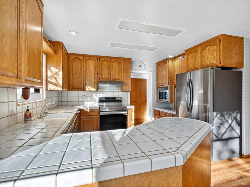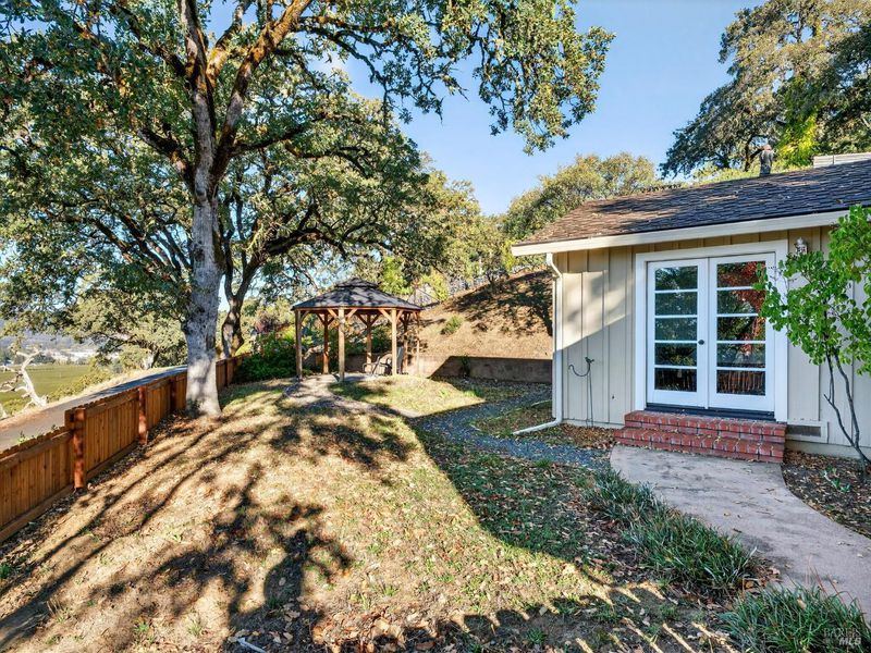 Set in one of Ukiah's most desirable neighborhoods, this custom built single story home offers expansive views of the valley, vineyards, and western mountains. With 4 bedrooms, 3 bathrooms, over 2,500 sqft of living space, this residence blends comfort, functionality, and privacy on 1.16 acres. This generous layout includes spacious living areas with hardwood flooring, a brick fireplace, and large picture windows showcasing sweeping views of the city lights, vineyards, and western hills. The kitchen includes a breakfast nook and plenty of storage, with an adjacent formal dining area. The primary suite offers two closets, a sitting area, and French doors leading outside. The ensuite bath includes double sinks, a tiled shower, and a separate jetted soaking tub. A separate wing provides additional bedrooms, office, and a full bath, ideal for guests or multi-generational living. Outside, enjoy a newly remodeled in-ground pool, sauna, and gazebo surrounded by mature landscaping. Two paved driveways offer ample parking, including space for an RV. An attached two-car garage and the privacy of a country setting complement the home's convenient proximity to downtown Ukiah.